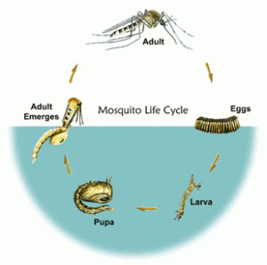The mosquito goes through four distinct stages of its life cycle; Egg, Larva, Pupa, and Adult. Eggs are laid one at a time or attached together to form “rafts.” They float on the surface of the water. In the case of Culex and Culiseta species, the eggs are stuck together in rafts of up to 200.